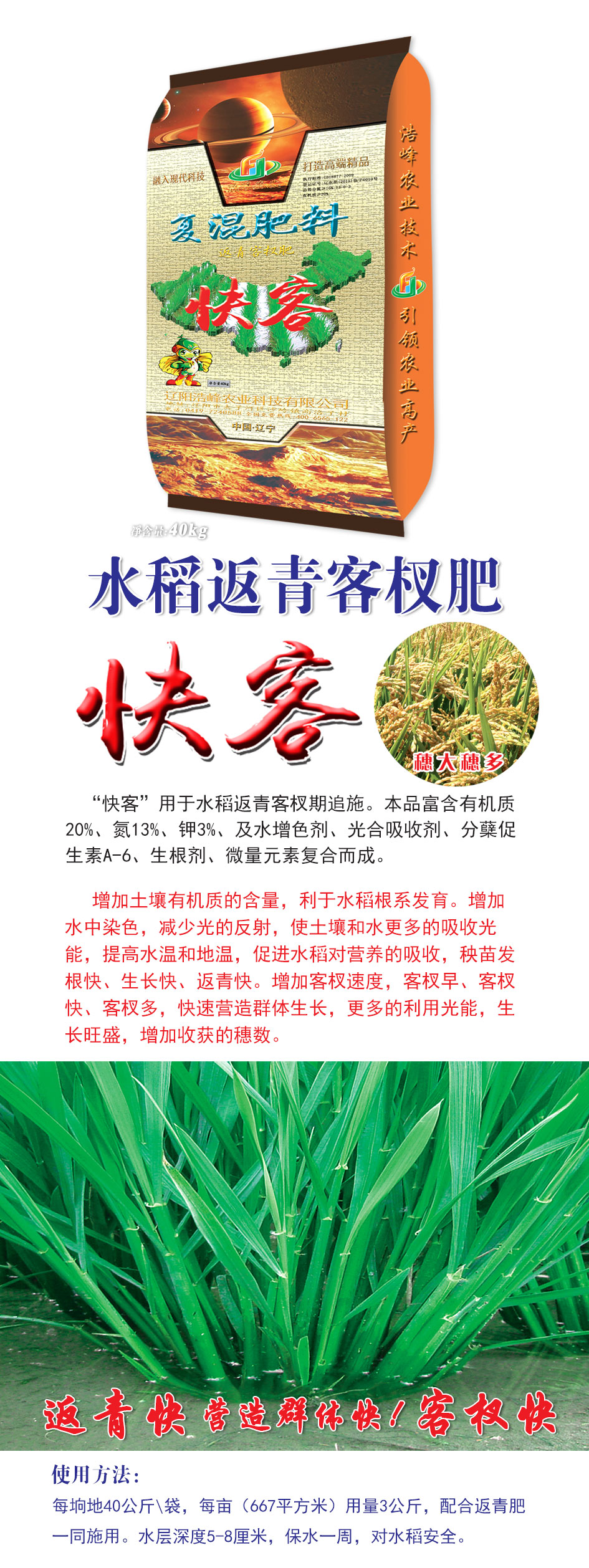 “快客”用于水稻返青客杈期追施。本品富含有機質(zhì)20%、氮13%、鉀3%、及水增色劑、光合吸收劑、分蘗促生素A-6、生根劑、微量元素復合而成。