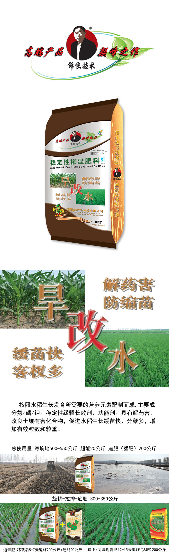 按照水稻生長發(fā)育所需要的營養(yǎng)元素配制而成,主要成分氮/磷/鉀。穩(wěn)定性緩釋長效劑、功能劑。具有解藥害,改良土壤有害化合物,促進(jìn)水稻生長緩苗快、分蘗多,增加有效粒數(shù)和粒重。