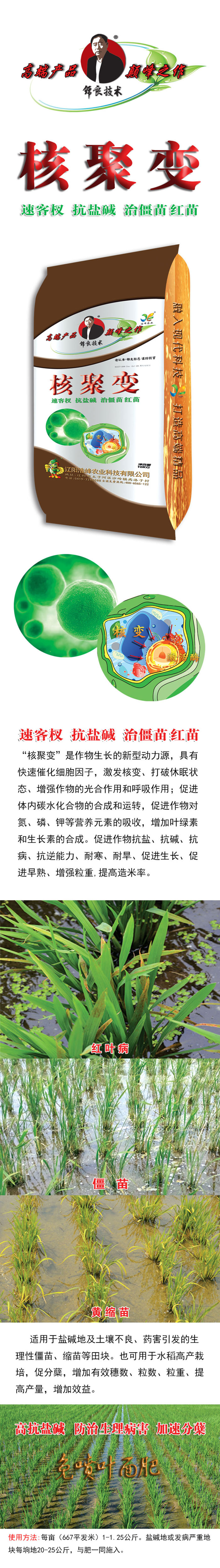 “核聚變”是作物生長的新型動力源,具有快速催化細胞因子,激發(fā)核變、打破休眠狀態(tài)、增強作物的光合作用和呼吸作用;促進體內(nèi)碳水化合物的合成和運轉(zhuǎn),促進作物對氮、磷、鉀等營養(yǎng)元素的吸收,增加葉綠素和生長素的合成。促進作物抗鹽、抗堿、宀?、抗逆能力、亩d?、亩d怠⒋俳?、促进钥r?、澡幙粒?,提高造米率。