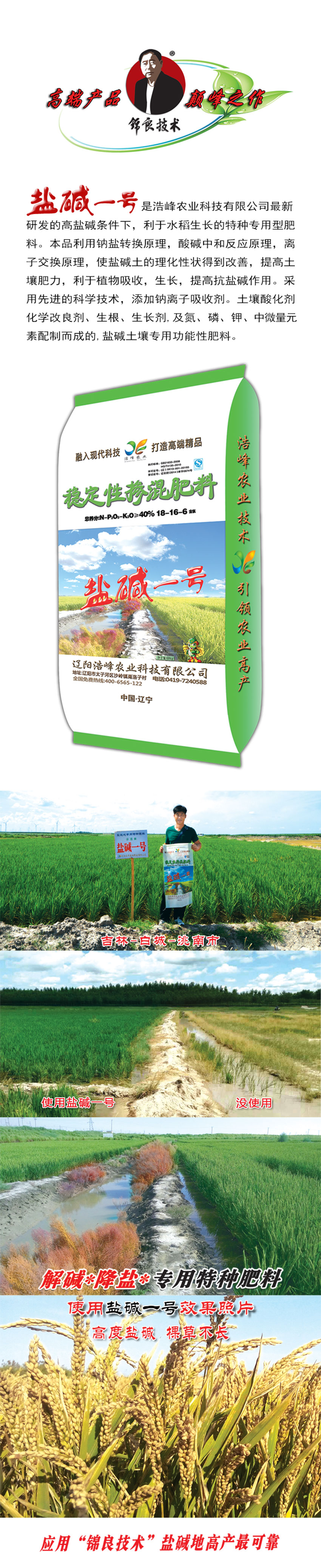 鹽堿一號是浩峰農(nóng)業(yè)科技有限公司最新研發(fā)的高鹽堿條件下,利于水稻生長的特種專用型肥料。本品利用鈉鹽轉(zhuǎn)換原理,酸堿中和反應(yīng)原理,離子交換原理,使鹽堿土的理化性狀得到改善,提高土壤肥力,利于植物吸收,生長,提高抗鹽堿作用。采用先進的科學技術(shù),添加鈉離子吸?。土壤藥F粱Ц牧技?、生根、生长?,及氮、磷、鉀、中微量元素配制而成的,鹽堿土壤專用功能性肥料。