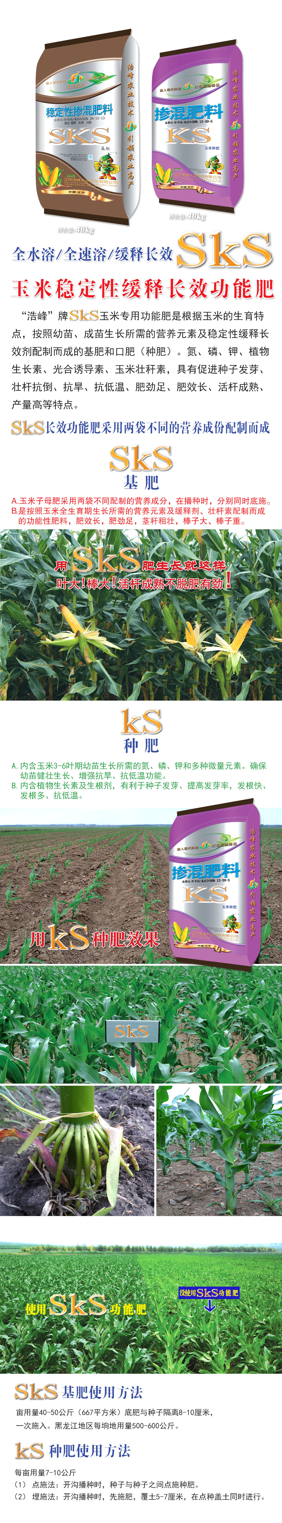 “浩峰”牌sks玉米專用功能肥是根據(jù)玉米的生育特點,按照幼苗、成苗生長所需的營養(yǎng)元素及穩(wěn)定性緩釋長效劑配制而成的基肥和口肥(種肥)。氮、磷、鉀、植物生長素、光合誘導素、玉米壯稈素,具有促進種子發(fā)芽、壯桿抗倒、抗旱、抗低溫、肥勁足、肥效長、活桿成熟、產(chǎn)量高等特點。